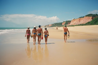A pousada era muito boa, com piscina fantástica e área de lazer enorme. Nosso quarto tinha uma salinha e varanda, e além de tudo tinha um restaurante delicioso. A praia em frente era muito boa também. Daí, uma hora eu estava passeando pela pousada, vi um lugar que me deu uma sensação de deja-vú. Eu fiquei pensando: já estive aqui… E não é que tinha estado mesmo? Há centos anos atrás eu fui numa festa ali, chamava Buraco Louco (imagina que loucura), e nossa pousada ainda guarda as ruínas desse lugar. Removi a história do fundo do baú da memória, porque nunca mais tinha me lembrado nem daquela festa e nem daquele lugar.Uma coisa que eu gosto de fazer quando vou para Arraial é caminhar pela praia até Trancoso. É uma caminhada linda, de uns 10km, emoldurada pelas falésias, tem um riozinho com uma pousada no meio para descansar. Delícia total. Chegando em Trancoso, é só aproveitar aquela praia deliciosa e pegar um busu para voltar para Arraial. Ou então encarar o caminho de volta a pé… Aí embaixo, o caminho entre Arraial e Trancoso.