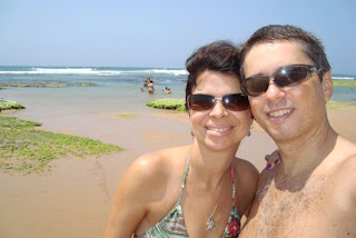 Eu e Léo na varanda do hotel. Detalhe para o mar ao fundo.