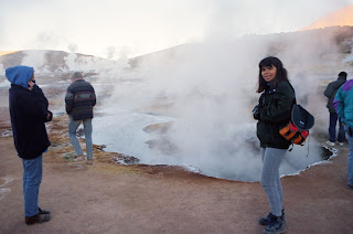 Acordamos no meio da madrugada, no escuro, para nos arrumar para uma excursão em direção aos Geisers del Tatio. Bruno e Glauco tinham esquecido de comprar água e eles ficaram tomando vinho mesmo, naquela secura toda. Lá no deserto, eu ficava cheirando uma toalha molhada, para sentir o mínimo de umidade no meu corpo. A seca de Brasília é nada comparado com aquilo.