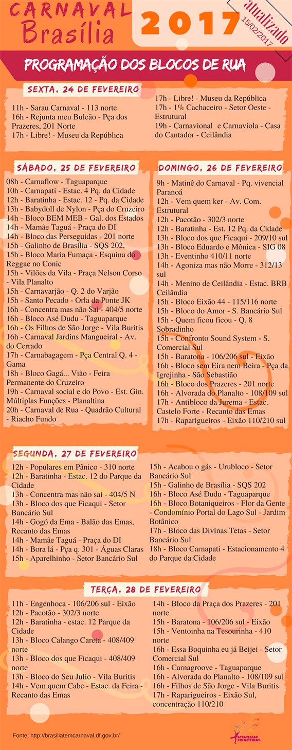 Fevereiro chegou, o Carnaval está aí e é hora de se planejar para a folia. Brasília ultimamente vem mostrando que sabe e curte fazer carnaval de rua. Eu não perco os blocos durante os dias de festa. Para te ajudar a se programar, aí vai a lista dos blocos com os horários.