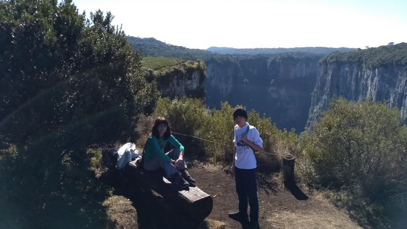 Escolhemos seguir a trilha do mirante (3km ida e volta), com bastante subida, mas trilha tranquila. Vamos margeando os canyons o tempo todo e o fôlego vai nos faltando, certamente por causa de tanta beleza que enche os olhos e o coração. Num momento da trilha, conseguimos avistar a lagoa do Sombrio e a Praia de Torres, no Rio Grande do Sul, tendo o mar lá no horizonte.